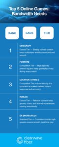 Cable remains the most common broadband option, but its upload speeds are often capped at just a fraction of its download rate. When multiple devices are online, that limitation can lead to lag and unstable gameplay.
